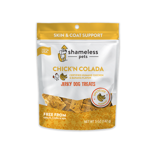 Description Ingredients Shameless Chick'n Colada Jerky Bites are chewy jerky dog treats made with chicken and upcycled sweet potato and bana...